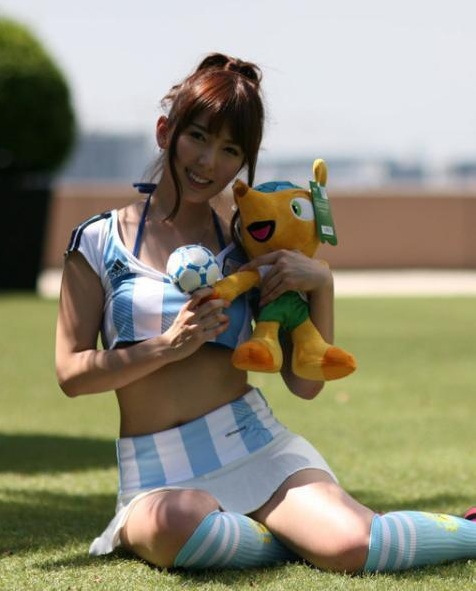 接下來我們來看看黑暗林志玲女神波多野結衣(はたの ゆい)怎麼瘋世足滴~結衣女神穿著改良式的阿根廷球衣露出美麗的腰線,感覺真的好健康好美麗~尤其是她那甜美的笑容,me-me女神團整團都穿著改良式球衣,粉絲們到底該選哪一個好勒?