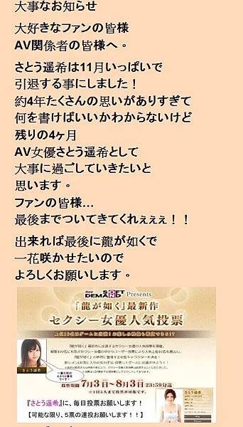 大家請準備好衛生紙,AV界的噴水女王佐藤遙希(さとう遥希),已經在twitter上宣佈、將會在11月的時候引退,結束自己的AV生涯!