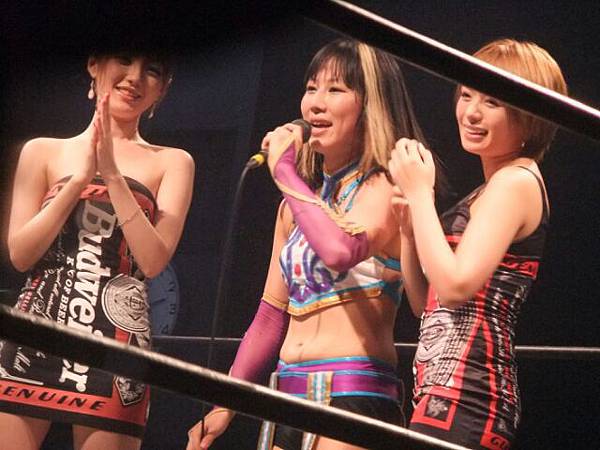 (摔角場上的正妹們(左起天海翼(天海つばさ)、紫雷美央、星美梨香))
