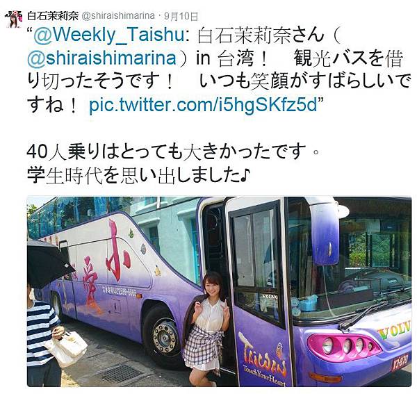 (白石茉莉奈在twitter中表示台灣的觀光巴士好豪華呀)
