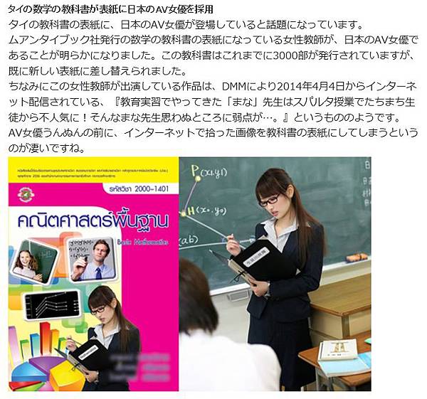 Google大神是很好用的搜尋引擎,不管是用來查資料、寫報告都可以找到需要的東西!但泰 國教科書出版商,隨手Google一下找尋適合的教科書封面照片時,竟然把愛情動作片內容誤認為教材,看到穿套裝在教室上課的女老師就拿來當封面,該糊塗 的出版商就把AV女優當成女教師,並開開心心的印在泰國學生的數學課本的封面中,還發給各了各大學校!被泰國民族報報導出來!