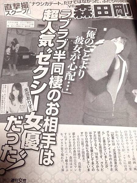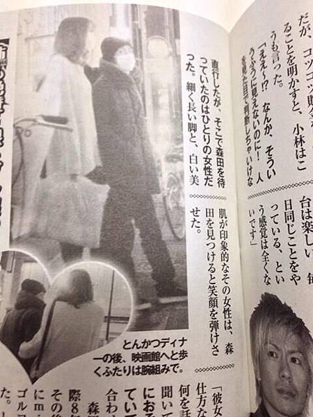今年四月才傳出的與E奶AV女優美雪愛麗絲甜蜜半同居,當時森田剛帶著美雪愛麗絲出門遛狗,返家時剛好被媒體跟拍,當時他阻擋鏡頭拍攝,為掩護女友離開,還主動停下受訪說: