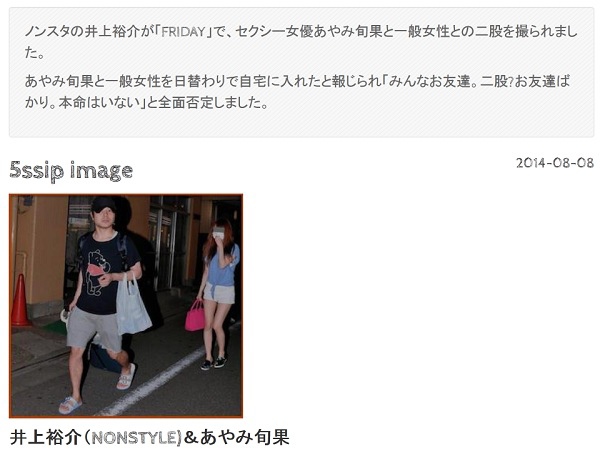 在今年的8月,綾美旬果也被拍到與日本搞笑藝人吉本興業的"NONSTYLE井上裕介" 一起回家,媒體指稱兩人目前戀愛ing中~女神戀愛的事讓粉絲很傷心呀~許多粉絲紛紛寫下憤慨的話語,~